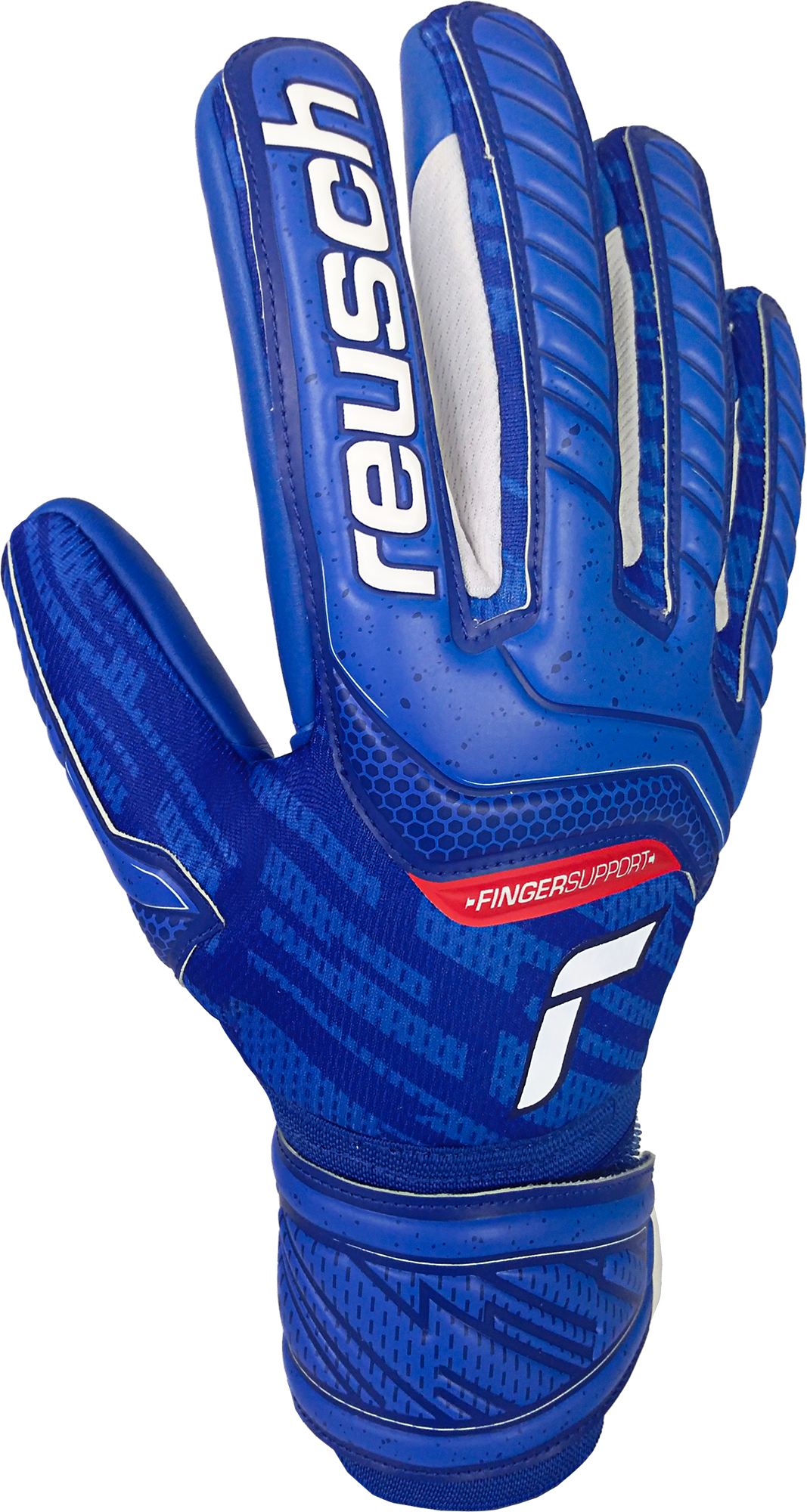 Attrakt Grip Evolution Finger Support guarantees reliable prevention from finger injuries thanks to the Finger Support protection system on all five fingers. The Reusch Grip latex is a completely new development and builds the base for all palm foams used in our collection. It features increased grip and good abrasion resistance. The DuraGuard patch on the palm offers additional resistance. Thanks to the newly developed 3d-shape with wrapped palm this style has great volume and feels very comfortable. This model is available in the main blue sponsoring colorway.
