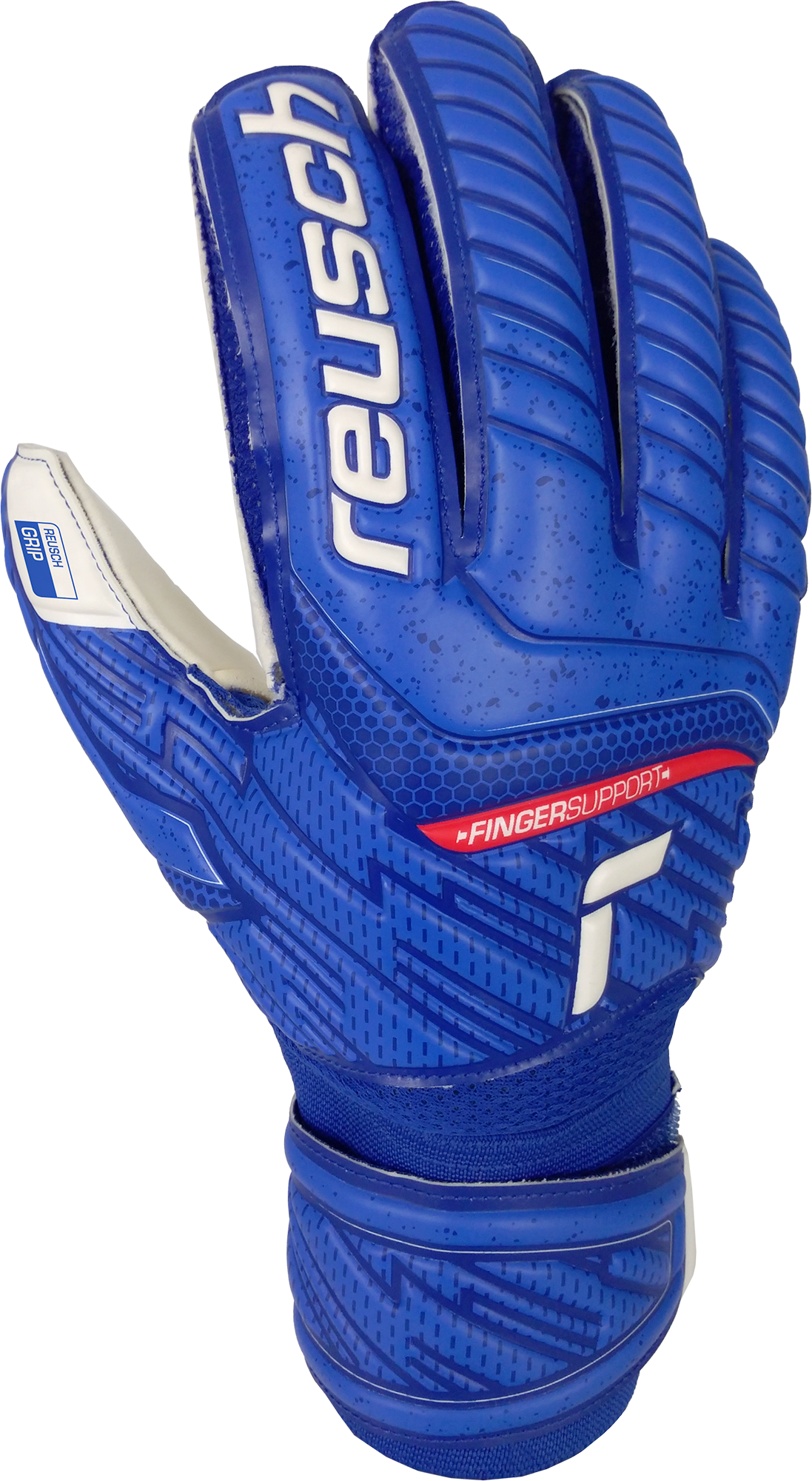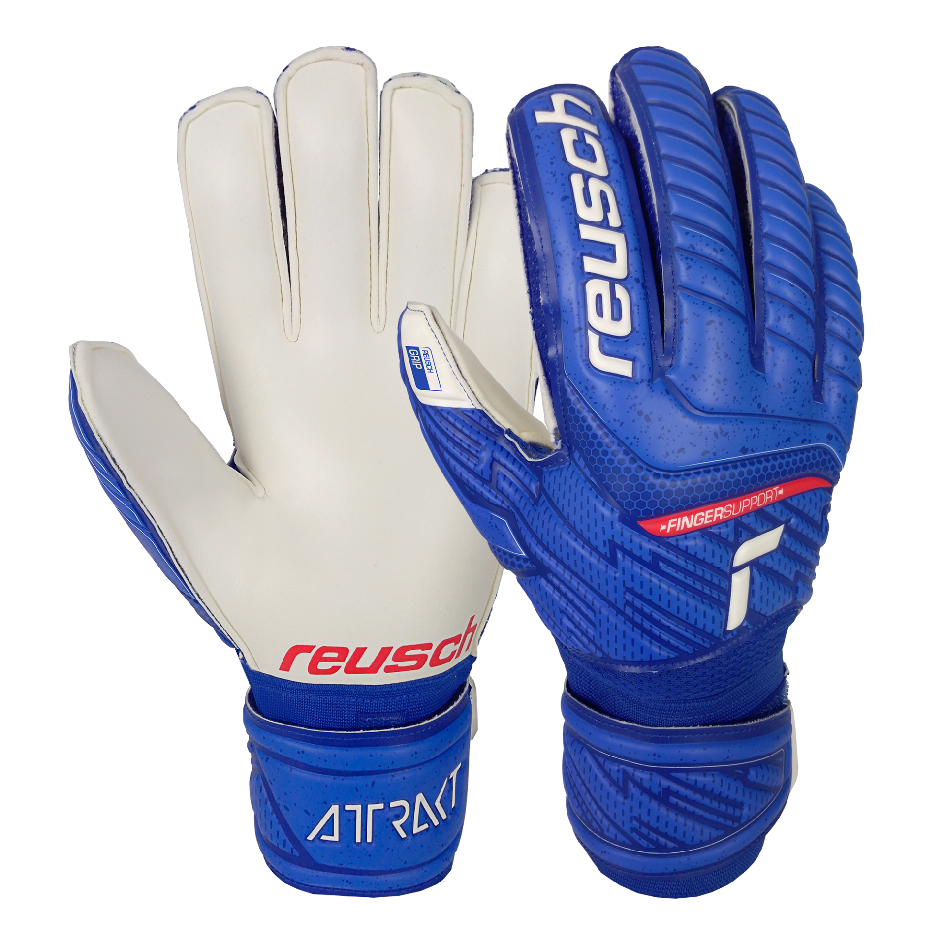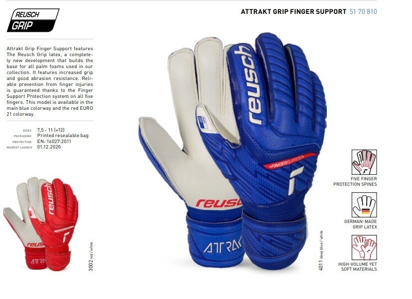 Attrakt Grip Finger Support features The Reusch Grip latex, a completely new development that builds the base for all palm foams used in our collection. It features increased grip and good abrasion resistance. Reliable prevention from finger injuries is guaranteed thanks to the Finger Support Protection system on all five fingers. This model is available in the main blue colorway.