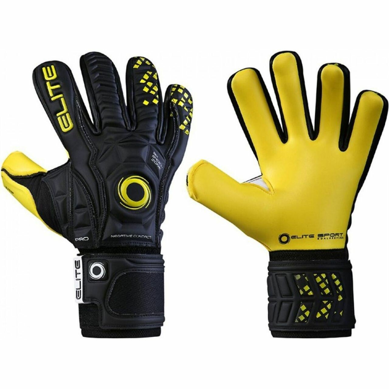 Elite Sport goalkeeper gloves BP. Palm Cut: Tighter-fitting negative cut with double wrapped thumb. Backhand: 3D-embossed, 4 mm durable GS latex + 4 mm reinforced backing foam on the Shock Zone + Air Ventilation Management AVM fabric. Finger Support: No finger spines in these gloves. Wrist Closure: 10 cm wide elastic wristband and 360 degree, 9 cm wide latex wrist strap.