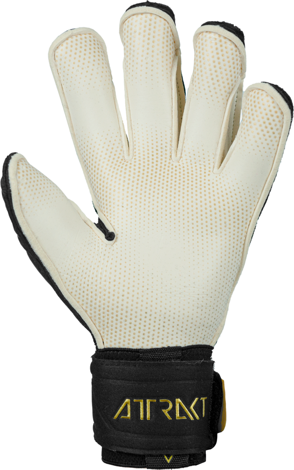 GluePrint technology and Ortho-Tec technology - a unique combination! The Attrakt Gold X GluePrint Ortho-Tec is based on the Reusch Grip Gold X applying a special sticky print on the palm latex. Due to this the tackiness and grip get enhanced exactly in those zones where it is needed the most. The positioning of the ink follows a precise pattern that is designed to cover exactly those areas of the palm that get in most contact with the ball when catching. This is reinforced by the Evolution Cut which is characterized by a large catching area and high wearing comfort which provides a direct and tight fit for a super ball control. The Ortho-Tec finger protection with five removable spines guarantees reliable protection and flexibility of all fingers. The textile backhand with latex punching zone keeps this snug fitting model not only soft and highly comfortable, but as well very breathable.