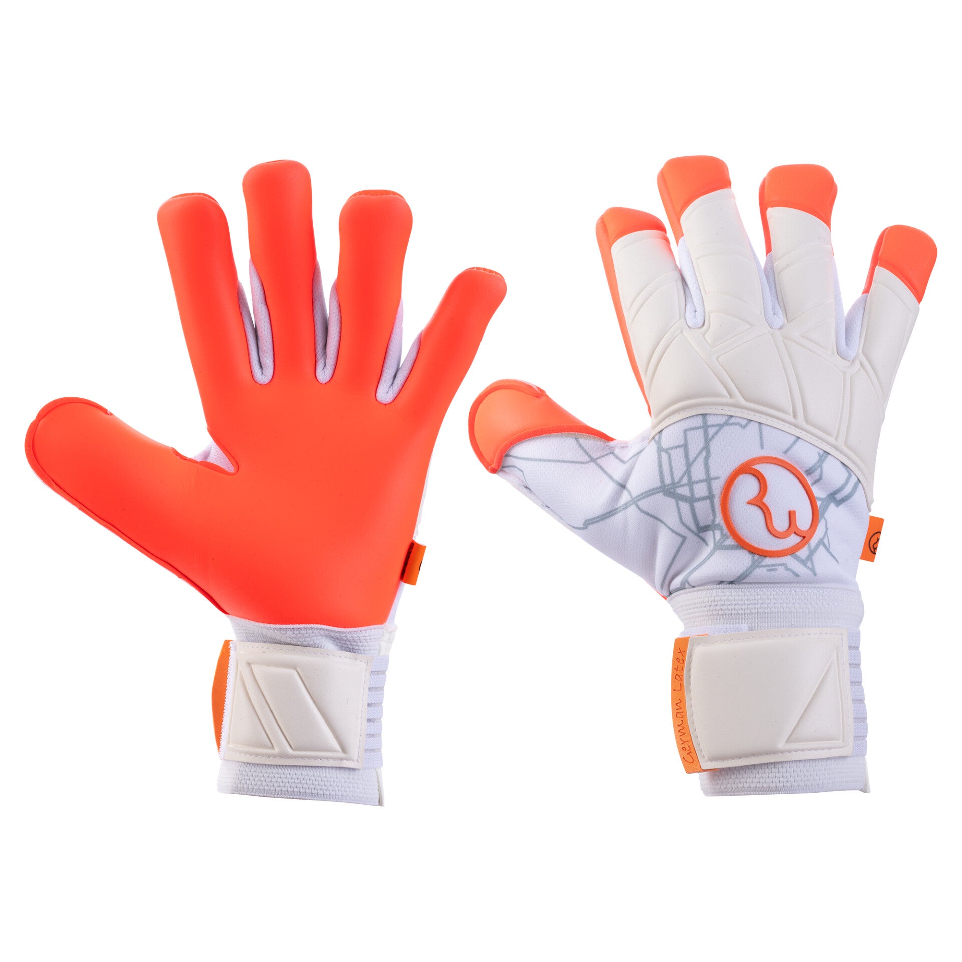 Metro One Touch Pro White/Orange with negative sewing for better fitting on the fingers, Performance mesh body white with silicon logo and sublimation printing. Upper hand part with 3 mm latex, foam extra soft 3,5 mm with 3 mm padding white and welding, thumb with wrap. 9cm wristband, strap 5,5cm wide with elastic band insert, silicone belt end.