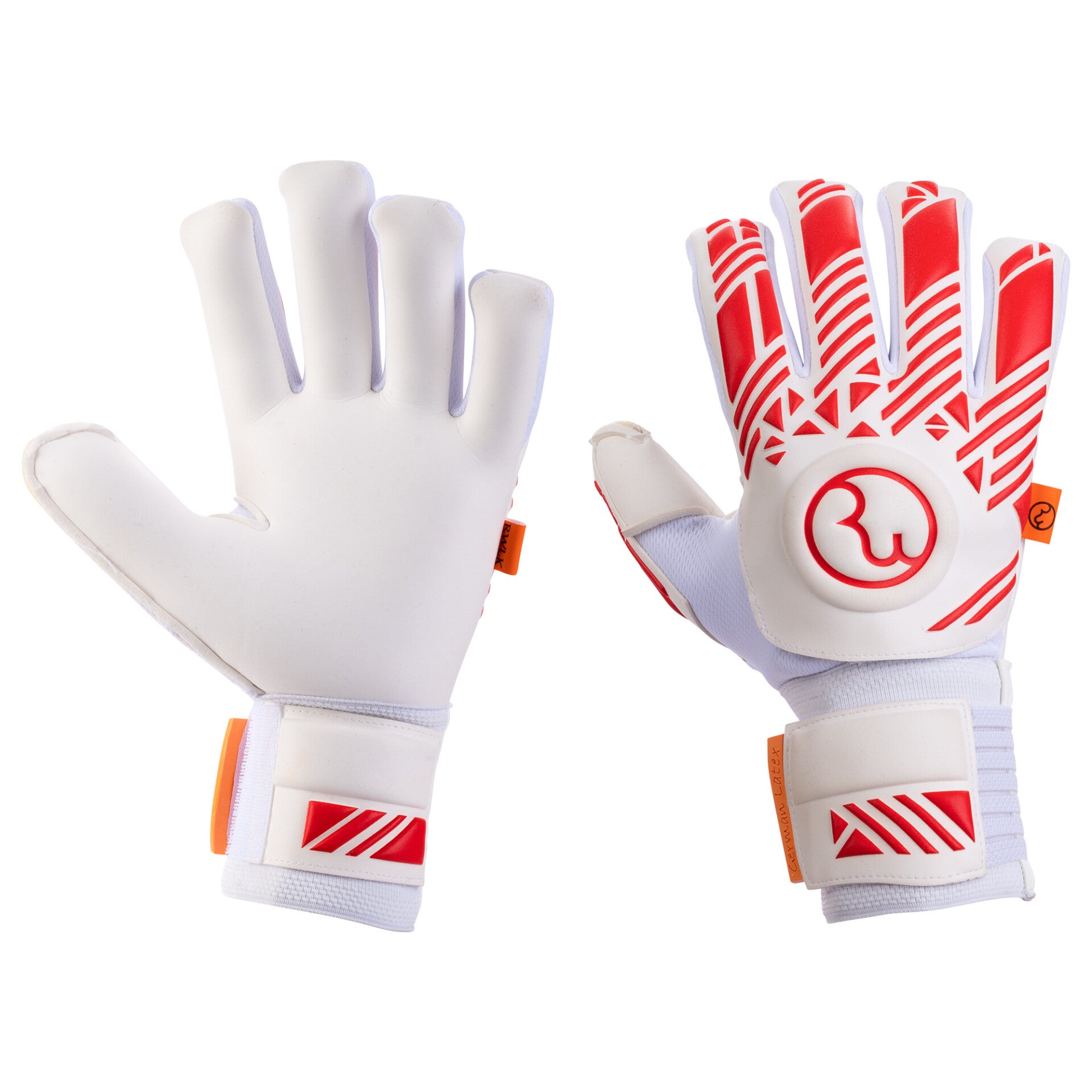 Clyde 4 Finger Spines Full Negative Red/White. Negative sewing for better fitting on the fingers, polyester mesh body white, flexible German latex upper hand. Polyester mesh white between the fingers. Extra soft 3,5 mm foam with 3 mm padding and welding. With half extra thumb part with thumb reinforcement positive sewing. 9cm wristband, strap 5,5cm wide with elastic band insert, silicone belt end.